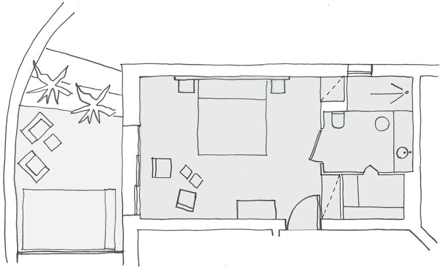 Chambre climatisée et non fumeur de 27 m2 avec terrasse - Literie 180x200 - Sauna à infra-rouge, Jacuzzi privé et accès direct à la piscine depuis votre terrasse privée.